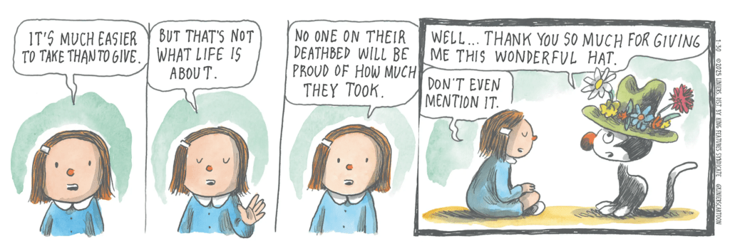Kilby comments: This Macanudo isn’t really “laugh out loud” funny (it’s closer to an “Awww”), but I found the diagonal framing (and the “lensing” effect in the title panel) so impressive that wanted to share it with everyone: