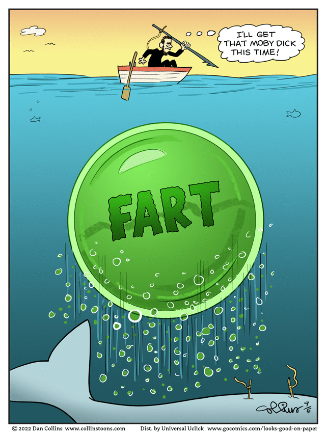 Dan Collins wasn’t taking any chances with misunderstandings: the label on the bubble seems gratuitous and unnecessarily crude, but without it, the color might not have been enough to identify the contents, since he did not indicate the precise location of the source.