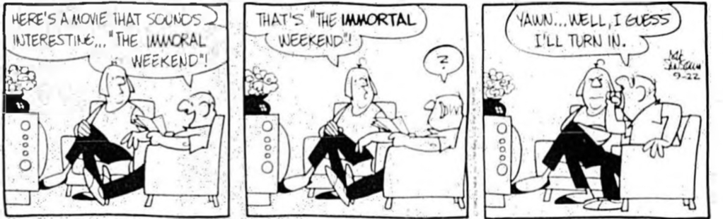 JMcAndrew sends this in: “IMDB and Rotten Tomatoes have no results for anything called “The Immortal Weekend”. Does Brutus think this is a pornographic movie?”