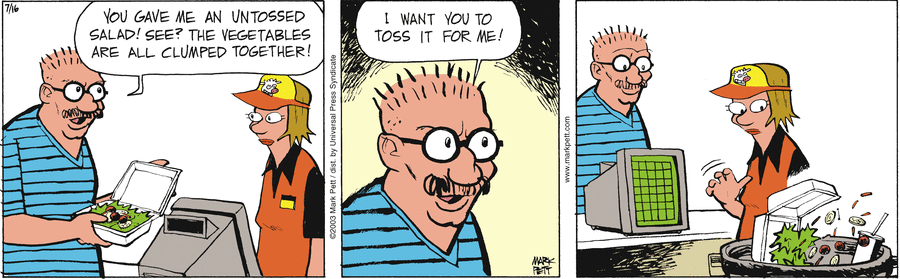 JMcAndrew sends in this pair, which get a Geezer Alert. “Shouldn’t she check to see what the contents of the disk are before she gets upset? I like that she’s holding it by the corner because she assumes it’s filthy and Arlo’s very reasonable confusion here. The antiquated technology only makes it funnier 30 years later.” If only she could. Gene’s not really wrong about compatibility, though. Our first PC was a Kaypro CPM machine, and its floppies weren’t readable by any other machine.