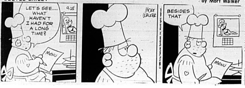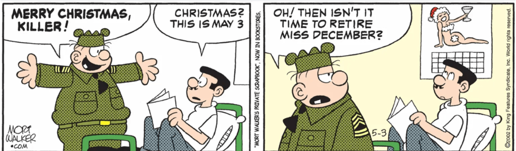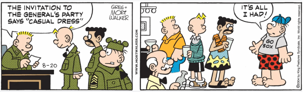 JMcAndrew sends in a few old Beetle Baileys, noting “Mort Walker was a weird guy.”
