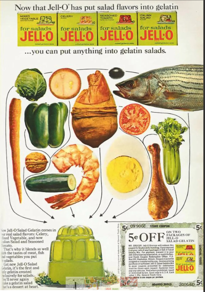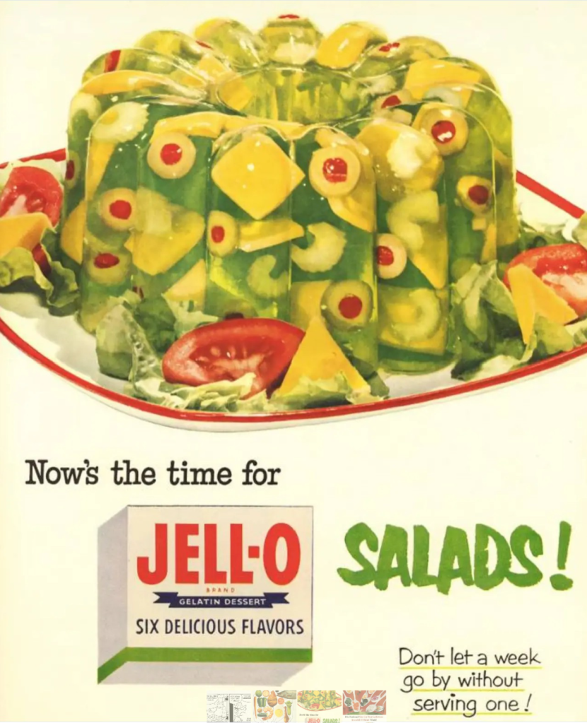 from Wikipedia: “By the 1950s, salads became so popular that Jell-O responded with savory and vegetable flavors such as celery, Italian, mixed vegetable, and seasoned tomato. These flavors have since been discontinued.”