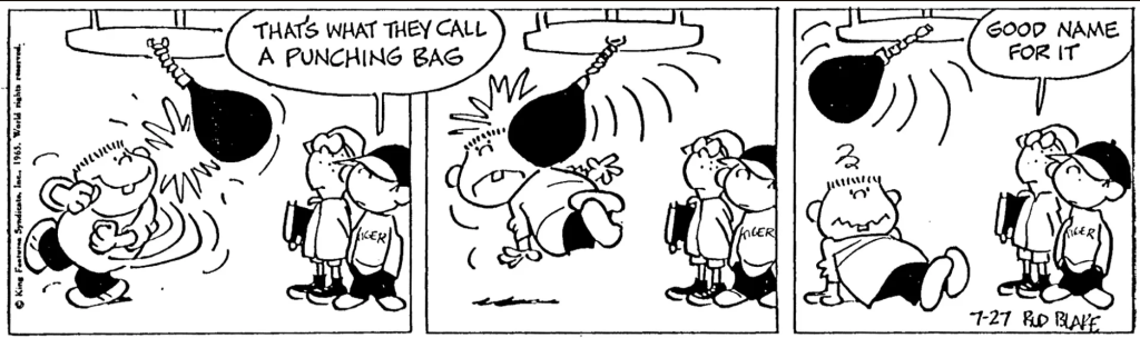 Mitch4 sends in this recently rerun Tiger strip: “The pun turns on a structural ambiguity. “That’s what they call a punching bag” and “Good name for it” (because it has ‘punched’ back at the kid who was using it) . The gerund “punching” takes on two different roles. Similar to (tho not identical to) the classic “Visiting relatives can be tedious”.”