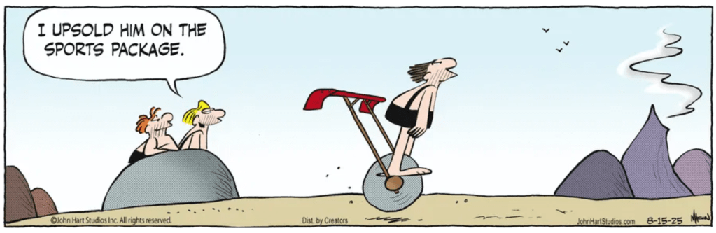 “This one is probably flawed by the last panel, where it seems the cartoonist gave in to the feeling that readers would need help with the senses of pivot word “down”.”