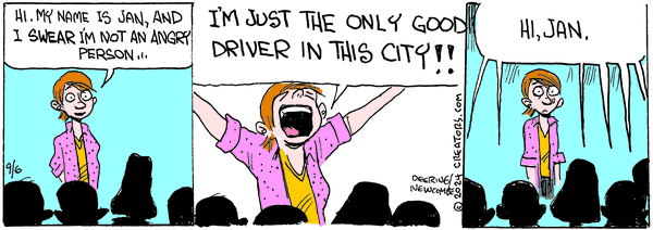Two driving comics that arrived in my email inbox on the same 06 September delivery. (The Zack Hill was one in a series about Jan’s assignment to anger management school.)
