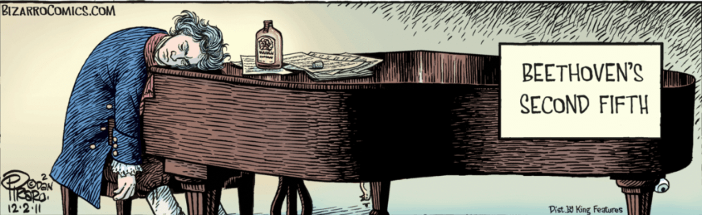 As seen above, the Fifth Symphony has long been a source for drinking jokes because of that peculiar fluid volume measure, one fifth (of a gallon, ICYMI). The opening three-and-one is pretty ubiquitous, though probably by now it is pure geezer to connect that with V-for-Victory.