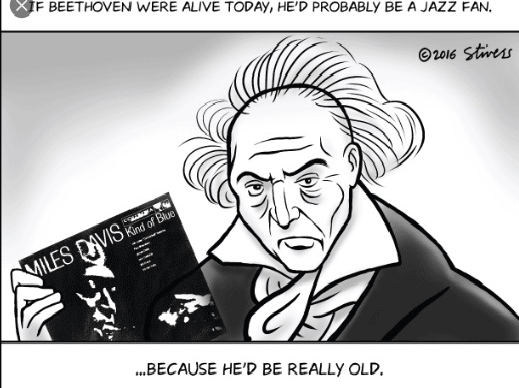 How confusing! It seems the prompt “If Beethoven were alive today, he’d probably be a jazz fan” and the picture would be coming from a fan of both LvB and Miles Davis. But then the take-it-back line about being old seems to be a put-down of both Beethoven and jazz as a genre.