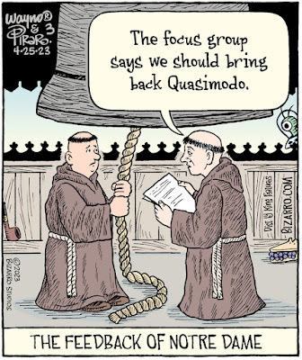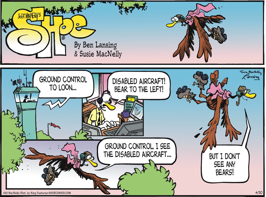 This “Bacön” comic (17-May-2024) was the third Friday in a row that Millsap attempted Peanuts-based satire (the other two weren’t much better). I never really liked Woodstock (nor the haphazard way that Schulz chose names for his newer characters), and it’s not the blood and gore that bothers me here. If a cartoonist is going to “borrow” characters for a gag, then it’s not enough duplicate the artwork: the characters need to retain their personalities, too. Snoopy never showed the slightest bit of hunting instinct in all five decades of Peanuts, so this comic is simply a dud.