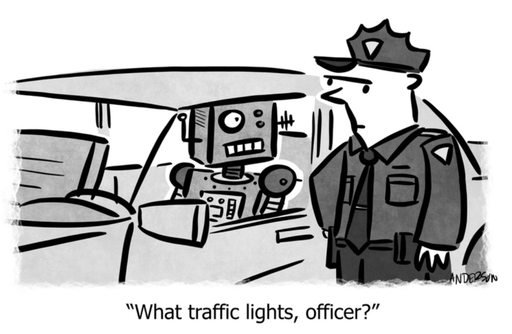 Jack Applin submitted this Andertoons as a CIDU, asking “Is the one-eyed robot unable to see the traffic lights? [OR] Is is programmed to ignore them, giving an advantage to “driverless” cars?“
