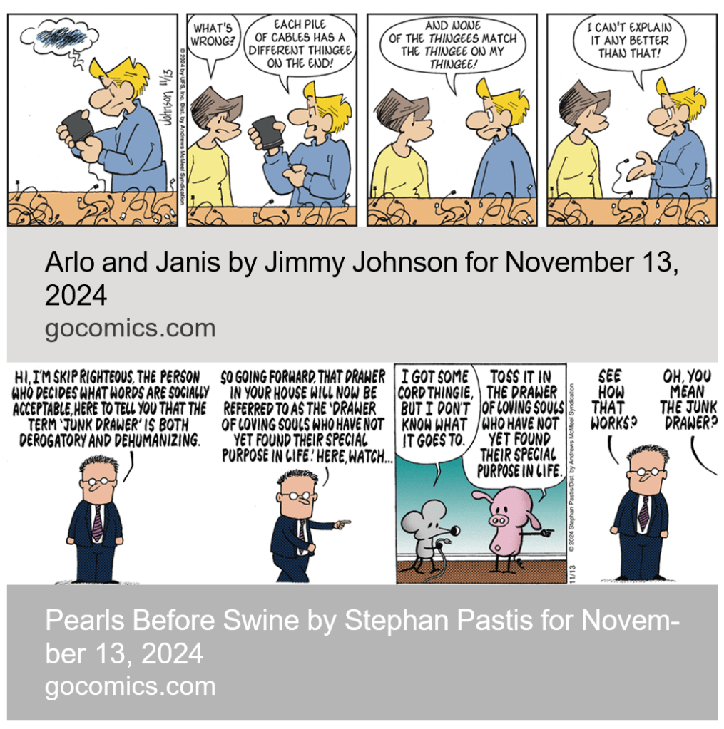 Bob Ball send in this as a LOL / synchronicity. We don’t publish synchronicities much anymore, but this is worthy of LOL. This is part of a thread on Pearls, where Pastis makes fun of oversensitivity towards certain terms by labelling junk drawer as an insult. But while I understand the term junk drawer, mine is a miscellany drawer; there are things in there that occasionally get used (e.g. double-sided tape). What do you call yours?