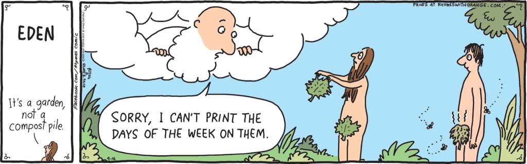 Boise Ed submitted this Rhymes with Orange as a CIDU, asking “It’s the old Adam-and-Eve scene, but why is his leaf attracting flies or other bugs and what’s with the days of the week?” – I think the answer is obvious enough to reclassify this as an LOL-Ewww: