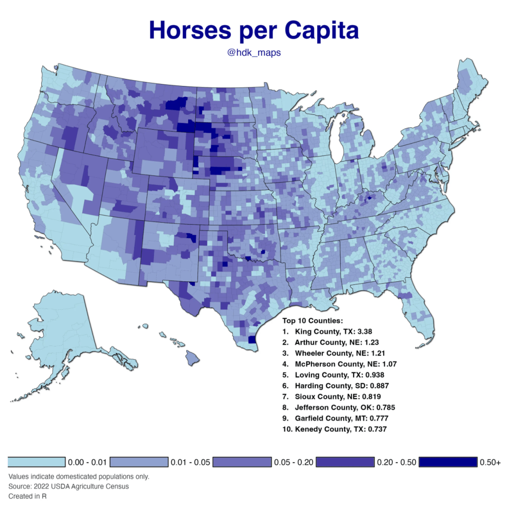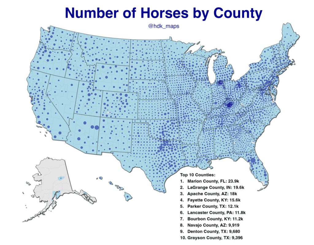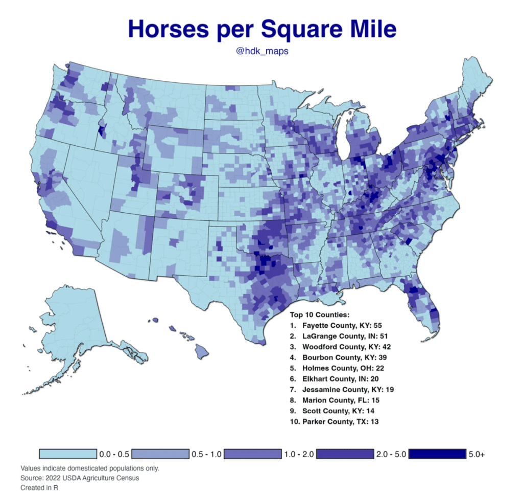 Your editor, a statistician, finds it interesting that the question of “where are there a lot of horses?” depends somewhat on how you map the data. All 3 maps are from Brilliant Maps, with the data originating with the USDA. For example, Fayette County, KY is #1 in horses per square mile, but not even in the top 10 in horses per capita.