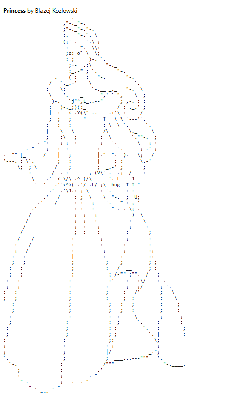 Definitely a Geezer Alert on this one. ASCII art was a big deal in the age of dot matrix printers and fanfold paper: printing out pinups was a rite of passage, along with “Happy Birthday” banners. These are from the ASCII art studio.