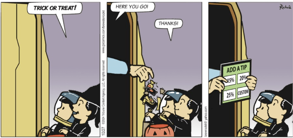 The joke is clear, if hackneyed by now, but what would the kids tip? A 20% trick?