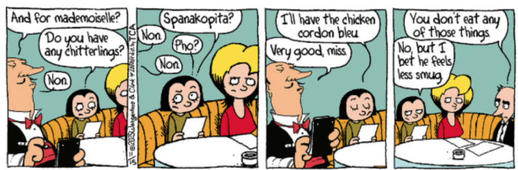 This one tripped me up, because I assumed a Pumpkin Spice Latte only had the spices used in pumpkin pie. This used to be true: introduced in 2003, Starbucks’ Pumpkin Spice Latte contained only the spices, and no pumpkin. That made sense. Who thinks steak sauce has steak in it? or shrimp sauce has shrimp in it? Or awlspice has an awl in it? But, in response to complaints, in 2015 they reformulated to add some pumpkin puree. That was really unnecessary, because a bit of pumpkin puree adds little taste. But this does mean Blazek’s joke actually works.