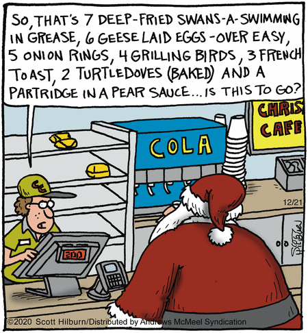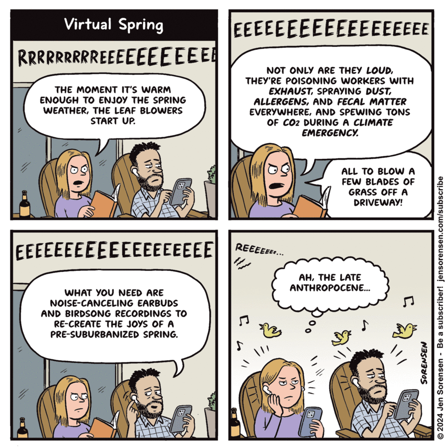 This “Bacön” comic (17-May-2024) was the third Friday in a row that Millsap attempted Peanuts-based satire (the other two weren’t much better). I never really liked Woodstock (nor the haphazard way that Schulz chose names for his newer characters), and it’s not the blood and gore that bothers me here. If a cartoonist is going to “borrow” characters for a gag, then it’s not enough duplicate the artwork: the characters need to retain their personalities, too. Snoopy never showed the slightest bit of hunting instinct in all five decades of Peanuts, so this comic is simply a dud.