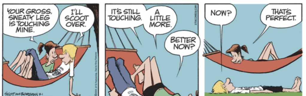 Boise Ed sends this in: “Absurd … Perhaps the category should be “Heaping scorn.” I can see no way they would both be on the hammock in the first place without serious cooperation.”