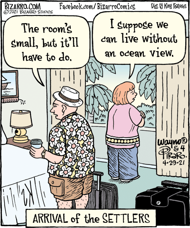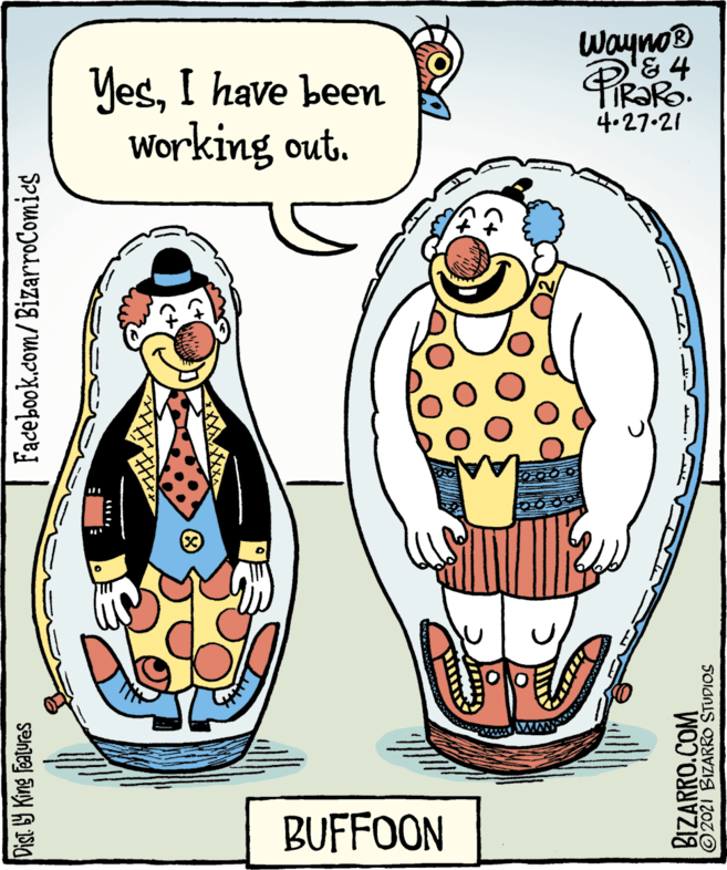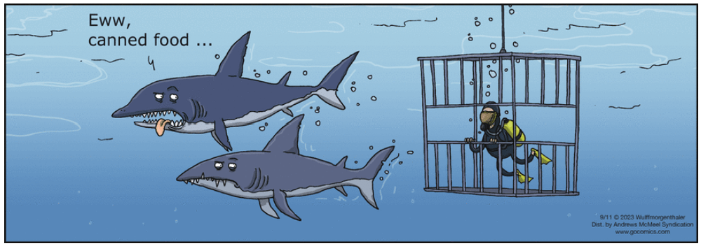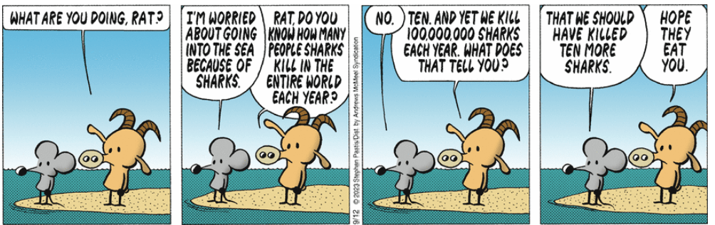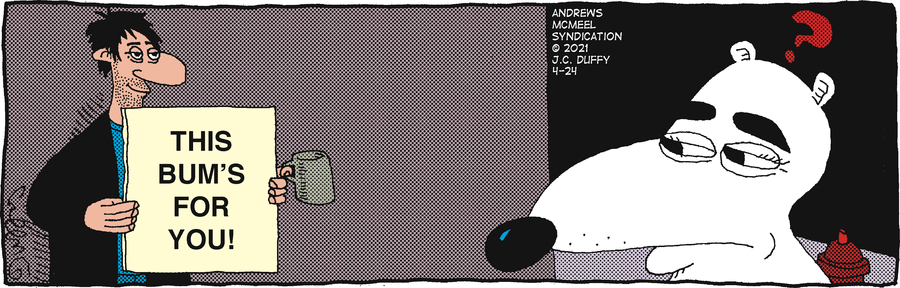 This “Bacön” comic (17-May-2024) was the third Friday in a row that Millsap attempted Peanuts-based satire (the other two weren’t much better). I never really liked Woodstock (nor the haphazard way that Schulz chose names for his newer characters), and it’s not the blood and gore that bothers me here. If a cartoonist is going to “borrow” characters for a gag, then it’s not enough duplicate the artwork: the characters need to retain their personalities, too. Snoopy never showed the slightest bit of hunting instinct in all five decades of Peanuts, so this comic is simply a dud.