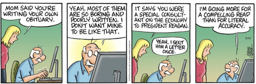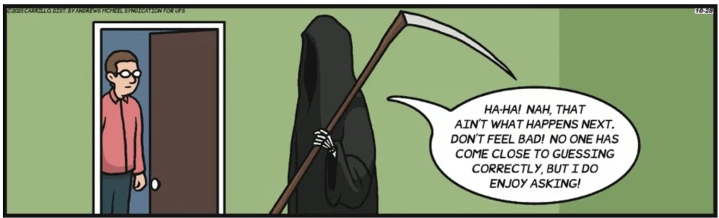 billr sends this in: “A whole sheaf of comics starring Death, of course, this time of year. But what is the question he’s talking about?”