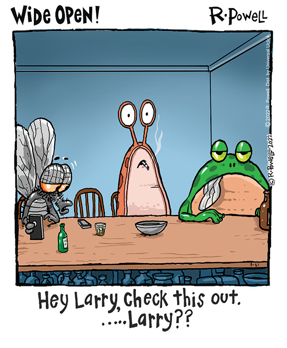 But then I realized the item hanging out of the frog’s mouth is not his tongue (which would be thin and ready to flick) but a wing tip, matching the wings we see on the speaking fly at the left. Well, that answers which of the explanations it was.
