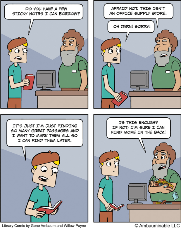 Okay, is it missing a beat, or brilliantly leaving unsaid, that Martin changes his mind because the patron reveals he is preparing to use highlighter or underline if he doesn’t have Post-Its?
