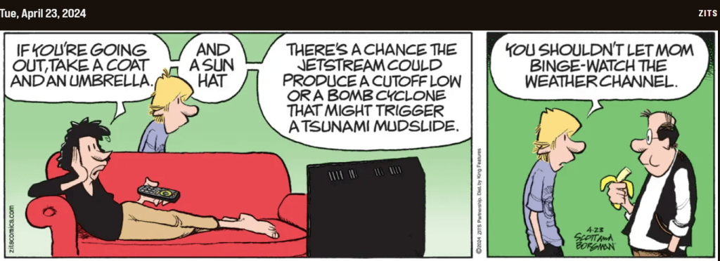 … Here’s what Dave wrote: “It seems the joke is supposed to be that the teenagers are so glued to their phones that they need to check the weather app to find out that they’re being rained on. But, it’s perfectly reasonable in that situation to check the forecast or the radar to see how long it’s going to last. And then there’s no joke. Or there’s something IDU.“